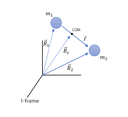 관성 좌표계에서 $m_1$과 $m_2$의 위치를 각각 $\vec{R}_1$, $\vec{R}_2$라 하고 무게 중심의 위치를 $\vec{R}_c$라고 하자. 이때 상대 위치는 $\vec{r}=\vec{R}_2-\vec{R}_1$으로 정의한다.