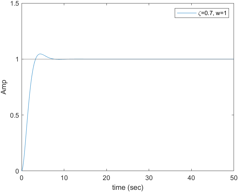 위의 경우로 보아 Step Response도 Impulse Response와 마찬가지로 $\zeta$에 따라 수렴성이 변한다. $\zeta$가 1보다 클 경우 진동하지 않으며 $\zeta$가 1보다 작을 경우 진동한다. 그러나 $\zeta$가 1보다 크게 되면 수렴하기 까지 시간이 오래 걸린다. 또한 $\zeta$가 너무 작을 경우 진동이 심해진다. 그러므로 적절한 $\zeta와 \omega$를 갖도록 M, K, C를 정해 주어야 한다.