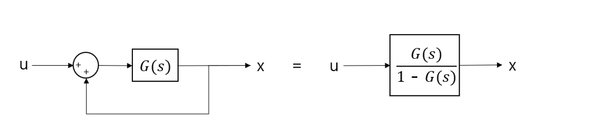 Open Loop System의 전달함수가 $G(s)$일때, Feedback System의 전달함수는 $\frac{G(s)}{1+G(s)}$이다. 이때 Feedback을 +로 하게 되면 전달함수는 $\frac{G(s)}{1-G(s)}$가 된다.