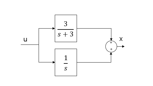 이와 같이 병렬로 연결된 시스템도 존재한다. 입력값이, 서로 다른 두 개의 시스템을 지나고, 두 결과값의 합이 출력으로 나오는 구조이다. 원형의 block은 두 값을 더하거나 뺌을 표시하기 위해 사용한다. $($원형 block에 아무런 표시가 없으면 +를 의미한다.$)$