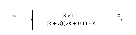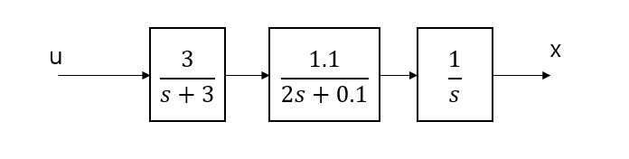 $\frac{1}{s}$은 적분을 의미하기 때문에, 가속도를 적분하면 속도가 되고, 속도를 적분해서 위치가 출력된다는 뜻이다. 가속도와 속도의 전달함수는 $\frac{1}{s}$이고 속도와 x의 전달함수는 $\frac{1}{s}$이라는 뜻이다. 그럼 가속도에서 위치로 변하는 전체 오픈루프 시스템의 전달함수는 어떻게 쓸 수 있을까? 가속도를 두 번 적분하면 위치가 된다는 사실로부터 $\frac{1}{s^2}$임을 알 수 있다. 즉! 위와 같이 직렬로 연결된 block diagram의 전체 전달함수는, 단순히 곱해주면 된다.