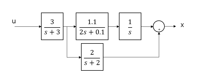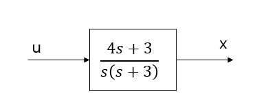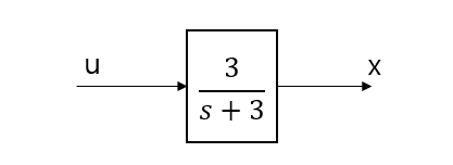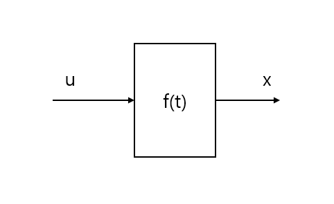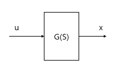 block diagram은 입력과 출력의 관계를 나타내는 그림으로, 입력 u가 block을 지나 x를 출력한다는 의미이다. block 안에는 시스템의 s-domain 전달함수나 t-domain의 함수, 혹은 미분 방정식 등을 포함할 수 있다. s-domain 전달함수가 포함되면 입력과 전달함수의 곱으로 출력이 계산되며, t-domain의 함수가 포함되면 입력과 함수의 convolution으로 출력이 계산된다. 미분 방정식이 포함되면, 출력은 미분방정식의 해 이며 그렇지 않을 경우 따로 나타내 주어야 한다.