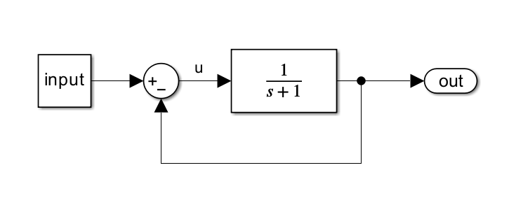$$\begin{cases} U(s) = Input(s)-Out(s) \\ Out(s) = \frac{1}{s+1}U(s) \end{cases}$$