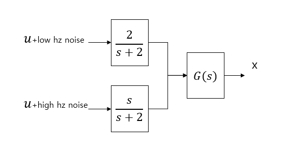 이러한 시스템은 입력에서 출력으로의 전체 전달함수가 어떻게 될까? 이미 윗줄에서 언급한대로, 두 전달함수를 더해주면 된다. 즉 아래와 같다.