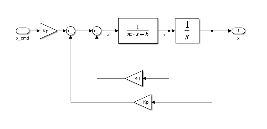 이 시스템의 DC gain은 1로, 명령값에 수렴함을 알 수 있다. 이때 제타 값은 어떻게 될까. 위의 방법과 동일하게 구하면 $\zeta = \frac{b+K_d}{2\sqrt{mK_p}}$가 된다. 즉 $K_d$로부터 제타값을 증가시킬 수 있다. 이를 이용하면 $K_p$값은 크게, $K_d$ 값또한 크게 설정하여 반응성도 빠르며 안정적으로 수렴하도록 만들 수 있다.