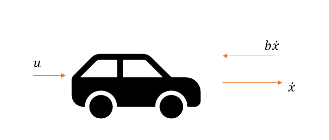 이 그림과 같이 추진력 u를 발생시킬 수 있는 자동차가 있다고 하자. 이 자동차의 위치를 10미터 이동시키고자 한다. 사용하고 있는 센서는 위치를 측정할 수 있다고 하자. 우선 물체의 동역학 모델은 아래와 같다.