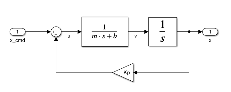 이때 입력값은 목표값인 X command이고 출력값은 x가 된다. 제어값 u는 X command에 x를 피드백하여 빼준 값으로 정했다. 측 목표값과 현재값의 오차가 되는 셈이다. 이러한 피드백을 Proportional Control, 흔히 P-Control이라고 한다. 이 경우 오픈루프와는 어떻게 달라질까. 우선 전달함수를 구해보자.